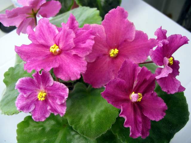 очень крупные полумахровые волнистые насыщенно-розовые звёзды с исходящими от центра к краю лепестка более тёмными лучиками.