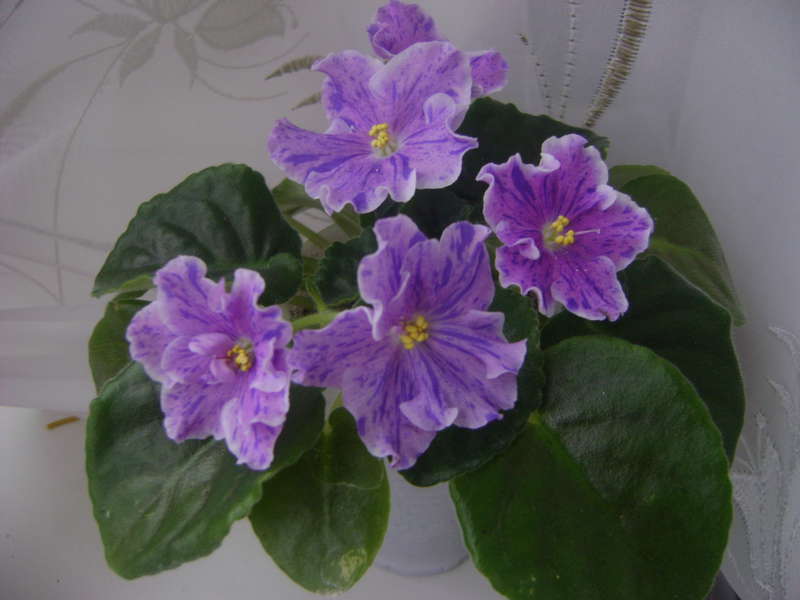 Крупные полумахровые лавандово-сиреневые цветы с обильным темно-синим фэнтази. Края лепестков украшает яркая белая кайма.